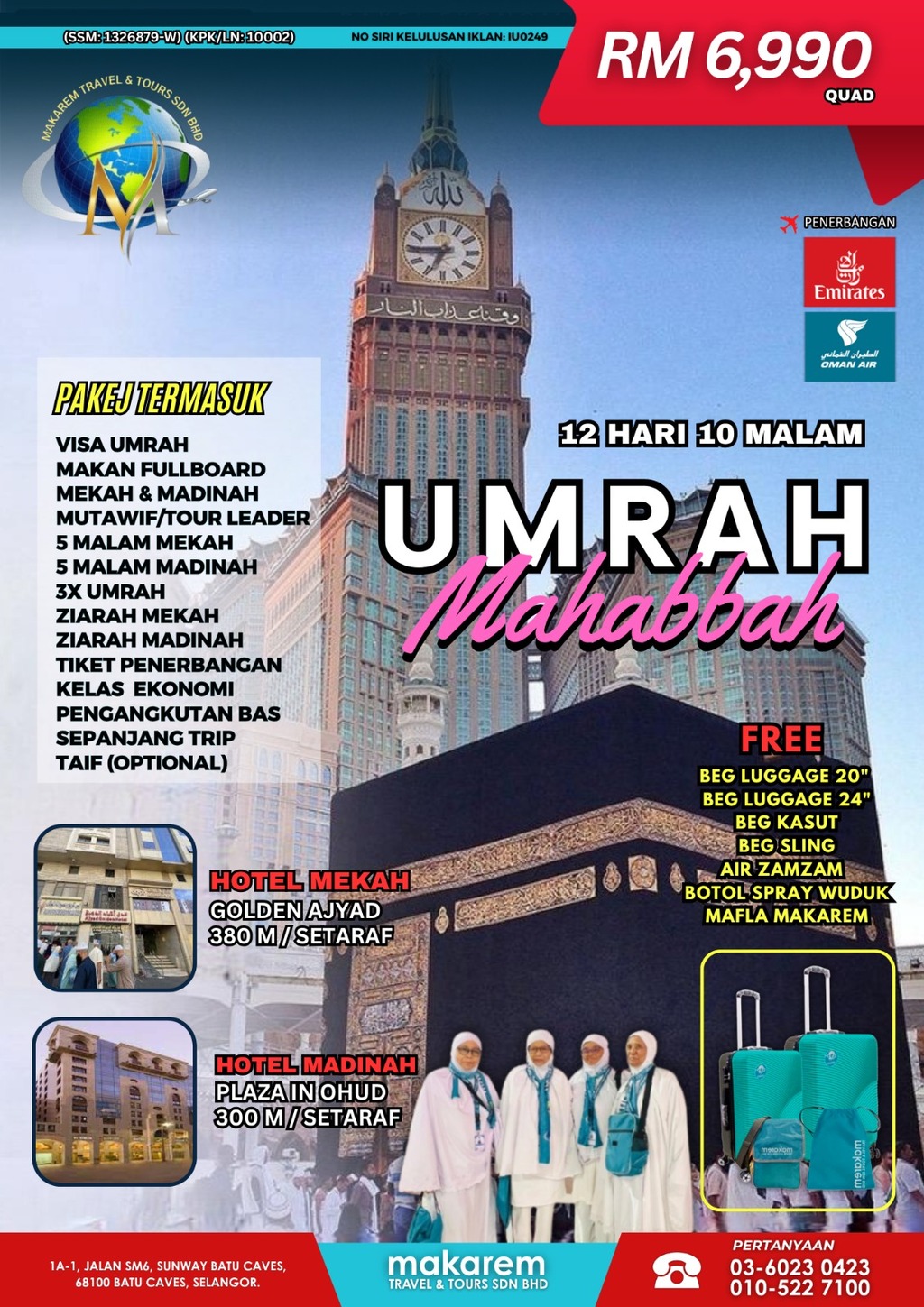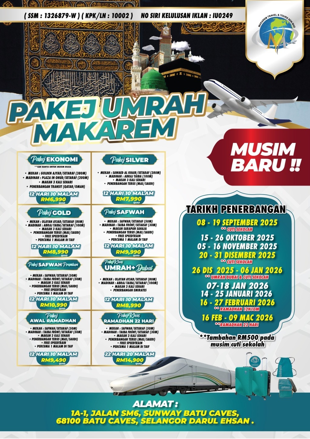 MAKAREM TRAVEL & TOURS SDN BHD (License No: KPK/LN: 10002) is a licensed travel agency under the Ministry of Tourism, Arts and Culture Malaysia (MOTAC). Established in 2019 and based in Sunway Batu Caves, Selangor, we offer UmrahPASTI packages – trusted, comfortable, and affordable pilgrimage journeys – along with Ziarah and international travel services.